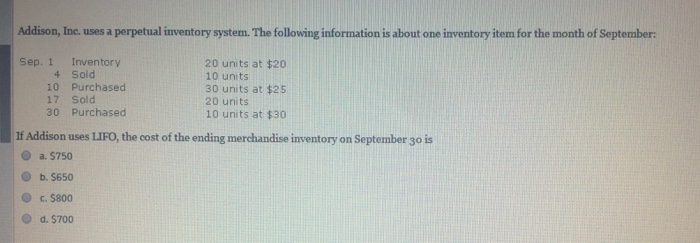 Addison Inc Uses A Perpetual Inventory System. If addison uses lifo, the september. 1 inventory 20 units at $20 4 sale 10 units 10 purchase 30 units at $25 17 sale 20 units 30 purchase 10 units at $30 if addison uses fifo, the cost of the ending merchandise inventory on september 30 is oa.